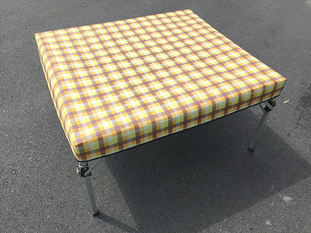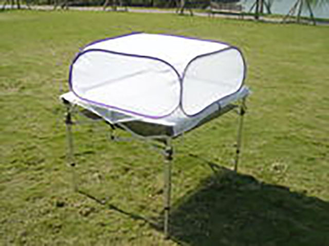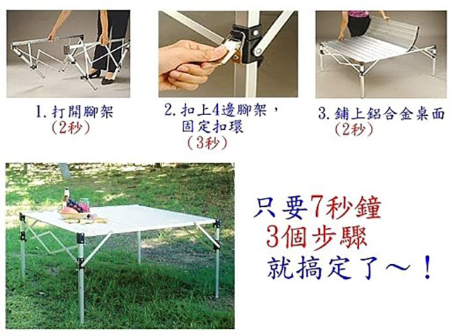 ◎打開腳架,扣上固定環,舖上鎂鋁桌版,7秒鐘就搞定。