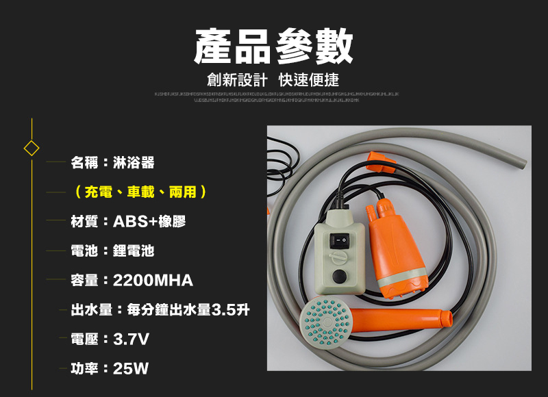 4.直接打開電源帶動微型抽水泵,適用於自駕戶外野營淋浴、海泳後臨時洗浴(建議配套專用的戶外淋浴帳篷或更衣帳篷使用),洗車、澆花等。